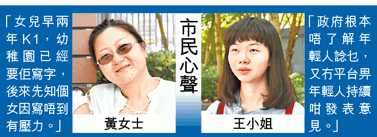 家長王太則指,兩年前就讀幼兒班的女兒已需執筆寫字,「我係過咗兩個月先知囡囡因為寫唔到,有壓力而唔開心」,指香港教育制度重成績,令不少學校均催谷學生,令學生壓力倍增。