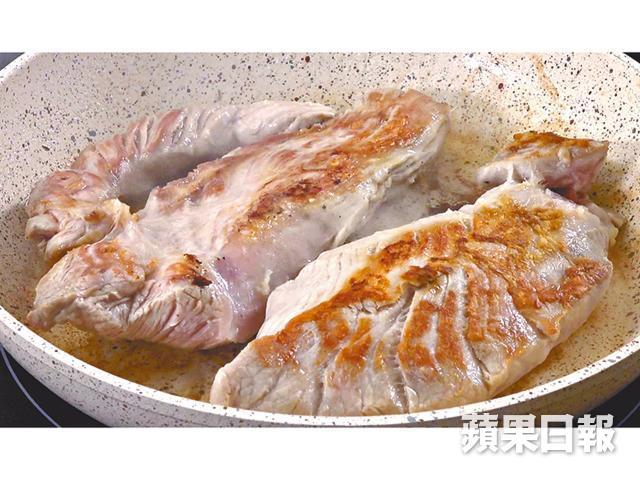 3.燒熱鑊,下油,放入豬柳,以中大火煎3分鐘,灑上香草,反轉再煎3分鐘。收中火繼續煎至肉熟。熄火靜置5分鐘,讓滲出的肉汁收回肉內。