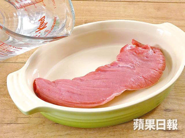 1.醃豬柳,如用方法一,可把水和鹽煮滾成濃鹽水,放涼備用。再加入深盤中浸泡肉,或依方法二,直接把鹽抹在豬柳上。