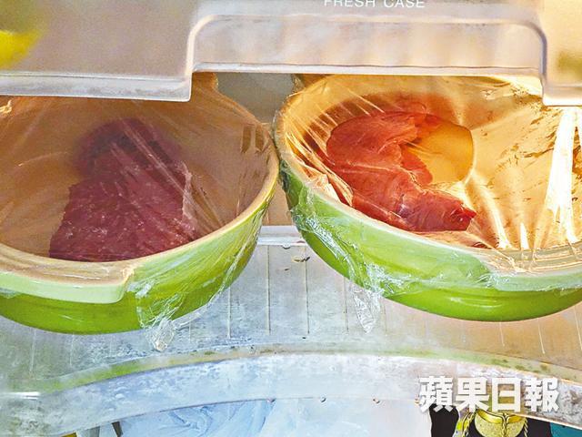 2.包好保鮮紙,把肉放入雪櫃下格醃4小時或一晚。取出洗走鹽份再抹乾水份。