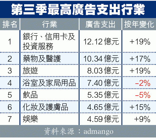 admanGO指,免費電視的廣告收入除因新的競爭而增加外,個別廣告商亦大幅提升電視廣告的預算。銀行、信用卡及投資服務於電視廣告的開支按年增長46%,當中以私人貸款的廣告支出最高,其電視廣告的開支亦按年上升47%。