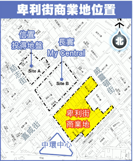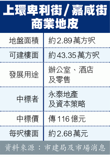 市場焦聚兩周前截標的上環嘉咸街/卑利街商業地皮,事關鄰近中環核心區,屬極罕地皮,發展涵蓋甲級寫字樓、酒店、零售店舖及公共休憩綠化帶,可建樓面43.35萬方呎,市場估值約80至130億元,結果9個財團入標,以本港大型發展商為主,中資無影,入標包括鷹君(041)、嘉里(683)、新世界(017)、新地(016)、長實(1113)、恒地及會德豐(020)、信置(083)夥拍利福(1212)。市建局昨日宣佈,項目批予永泰地產及資本策略組成的財團。