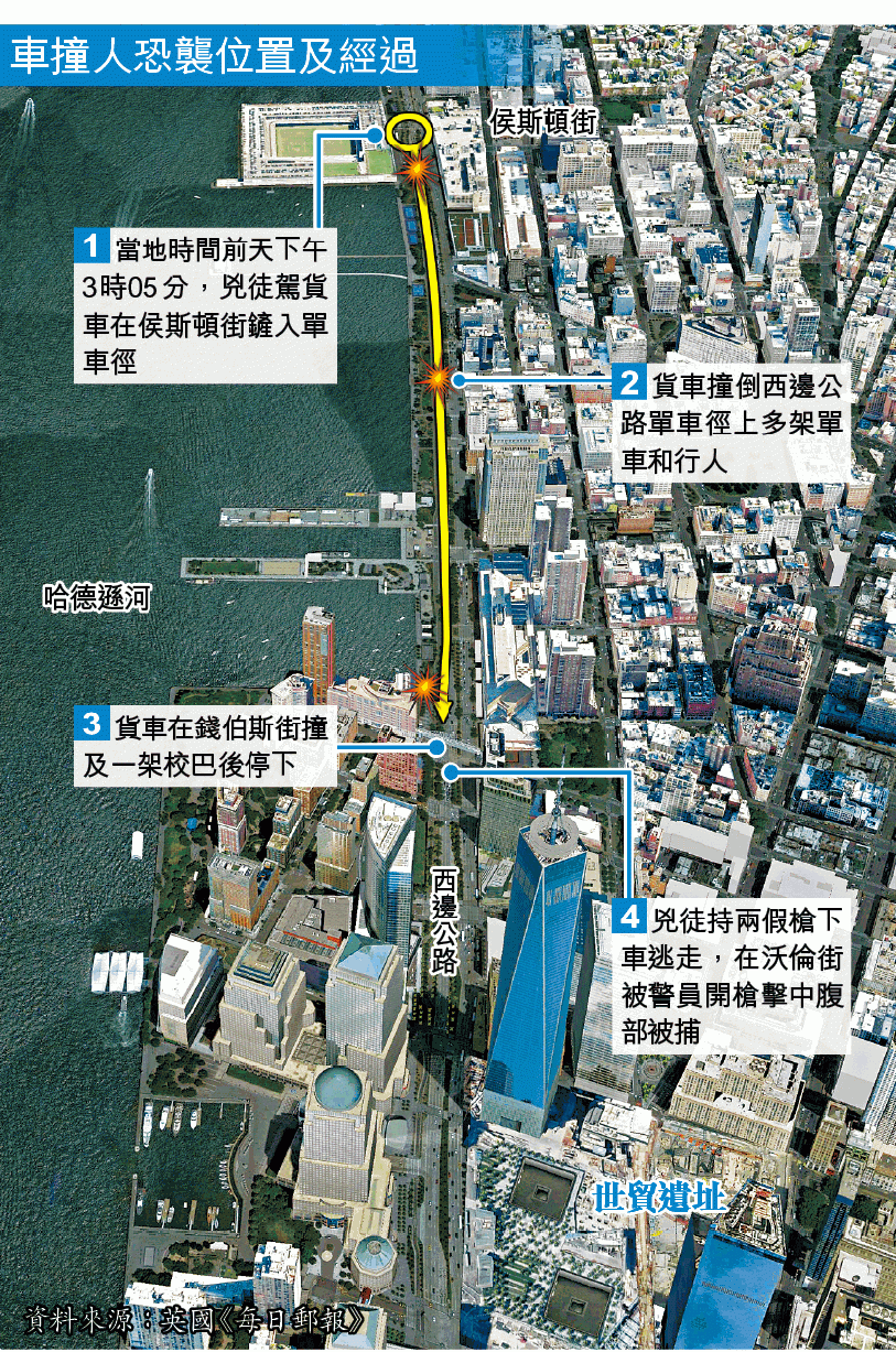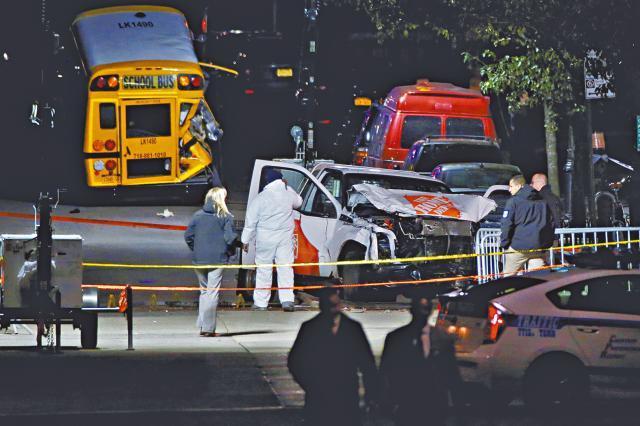美國紐約舉行萬聖夜派對前,遭逢911襲擊後首宗致命恐襲。一名宣稱效忠恐怖組織「伊斯蘭國」(IS)的烏茲別克移民,前日在曼哈頓區911世貿遺址附近,駕駛貨車鏟上單車徑瘋狂撞向途人,釀成8死11傷,後遭趕到的警察開槍制服。紐約市長白思豪(Bill de Blasio)形容襲擊是「針對無辜平民的懦夫式恐怖行徑」。