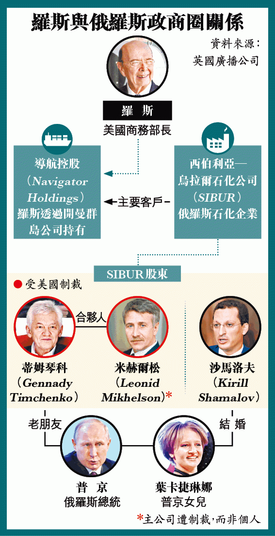 79歲的羅斯本身是美國總統特朗普富豪朋友,去年12月獲提名為商務部長時,其強硬對華立場是焦點。文件披露他透過開曼群島公司持有船運公司「導航控股」(Navigator Holdings),後者自2014年開始靠着為俄企西伯利亞─烏拉爾石化公司(SIBUR)輸送石油及天然氣,已累計賺取6,800萬美元(5.3億港元);而SIBUR其中一位股東是普京女婿沙馬洛夫,還有兩位股東在美國制裁俄羅斯名單之列。