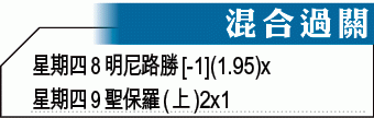 正值國際賽期,巴甲仍加開周中快車,其中明尼路(圖)主場對戈亞尼恩斯,主隊有中場奧迪路代表國家隊而缺陣,不過以一對老牌前鋒羅賓奴及費特的級數,主場亦偶有佳作,面對榜尾的戈軍可開殺戒,「讓球主客和」「主勝」可捧。