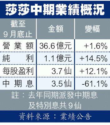 他指,下半財年擬開設2至3間新店,目前港澳分店總數維持115間。據業績公告顯示,最近港澳數據趨穩,10月至11月15日零售銷售按年升5.8%,同店銷售亦升0.8%。莎莎昨收報2.9元,升2.5%。