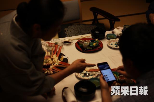 抵達當日女將告知當日1.3kg的大蟹不及1kg的完美,惟有退而求其次,兩位拆蟹專家捧着兩隻各種1kg的雄蟹讓我們驗證,蟹腳穿一隻黃指環,用手機一對QR code,蟹的身世就一目了然。吃過全用當地食材做的懷石,八寸、向付け、蓋物、先附、御造,期待的主角來了,早上還在海洋裏的蟹已經歷經了三種不同的烹調方法,都是蟹腳,做刺身是甘甜、炭燒又多了一分惹味、最原汁原味的是茹で,即鹽水烚,有兩個專人負責拆殼,我只負責將肥美的蟹肉送入口,1.3kg的蟹!這任務不容易呀!1kg二人分吃又或一人一隻0.6kg,肚皮都應該會更好受,上帝判刑都應該可從輕發落。