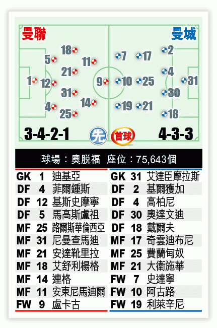 榜首的曼城今季在聯賽所向披靡,共獲14勝一和,今役只要勝出,便可拋離對手;不過,藍月的銳勢近仗似有所減退,連續三場聯賽都只能僅勝實力較次的對手,而且上仗歐聯半弱陣下不敵薩克達,今季所有賽事不敗之身終被破,對士氣始終有影響。由於他們目前已領先次席的曼聯八分之多,可以說是有失分空間,球員或會出現輕敵的情況。因此,就算藍月預料今役有前鋒阿古路、中場史達寧及後衞高柏尼等主力悉數復出,只有後衞史東斯及班捷文文迪養傷,實力完整,亦不宜過份高估。畢竟,曼城近四次訪曼聯,只得一勝一和兩負的成績,上盤客隨時損手。
