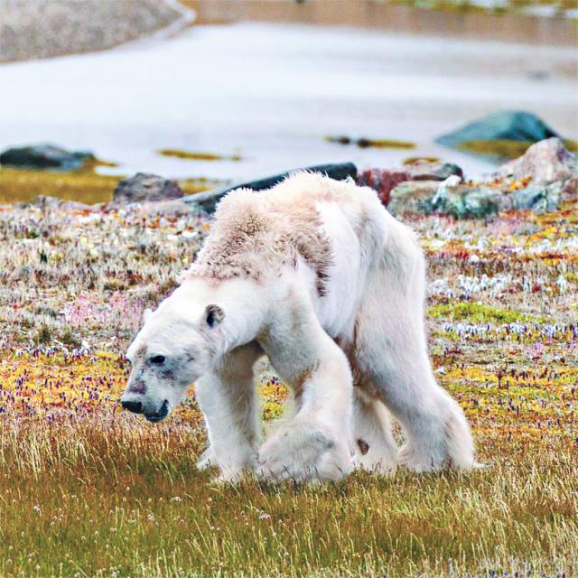 「虎背熊腰」不一定魁梧壯健。保育組織「Sea Legacy」公佈今夏在加拿大北極區拍到的駭人畫面:瘦骨嶙嶙的北極熊,在沒有半粒冰雪的地上覓食。令人不安的影像揭示氣候暖化已到了極之嚴重的地步。