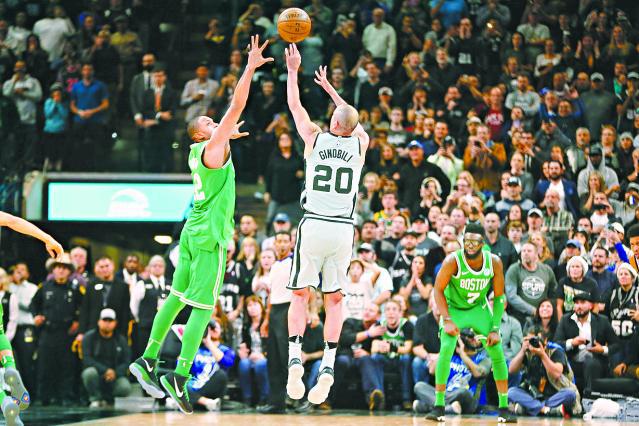 【NBA蘋足全場】老兵打不死!馬刺上周五晚在NBA常規賽憑40歲老將真路比利(Manu Ginobili)在完場前五秒射入奠定勝局的三分球,主場以105:102勇挫東岸一哥塞爾特人,取得三連勝。