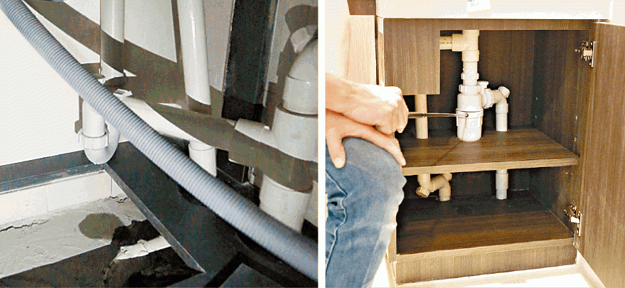 垃圾可清,污迹可除,來去水也要扣到零分。廁所洗手盆去水喉隔氣漏水,櫃底可見新舊水迹交替,問題存在已久,詹sir扭實後再試水,沒料到仍然漏水,資深驗樓師詹濟南(詹Sir)指出:「扭實咗都漏,隔氣杯應該喺地盤被壓扁咗,嗰杯變咗形,好似鵝蛋咁,呢種情況要換,或者綑防水膠布,最好當然係換咗嗰杯。」