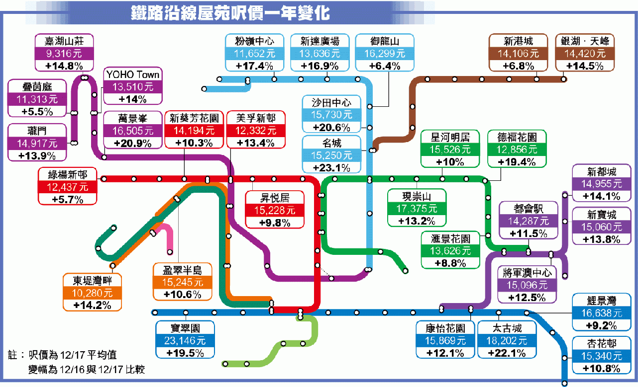 【本報訊】香港樓價今年升14%,各區鐵路沿線物業雖然只有三分一可以看齊升幅,但萬元呎價盤已幾近消失。本報統計31個鐵路屋苑,年內平均升逾13%,當中大圍名城登上鐵路盤升值王,升幅高達23.1%,其次為港島指標屋苑太古城,升22.1%。另外,呎價萬元以下的鐵路盤由去年的3個減至只有天水圍嘉湖山莊。