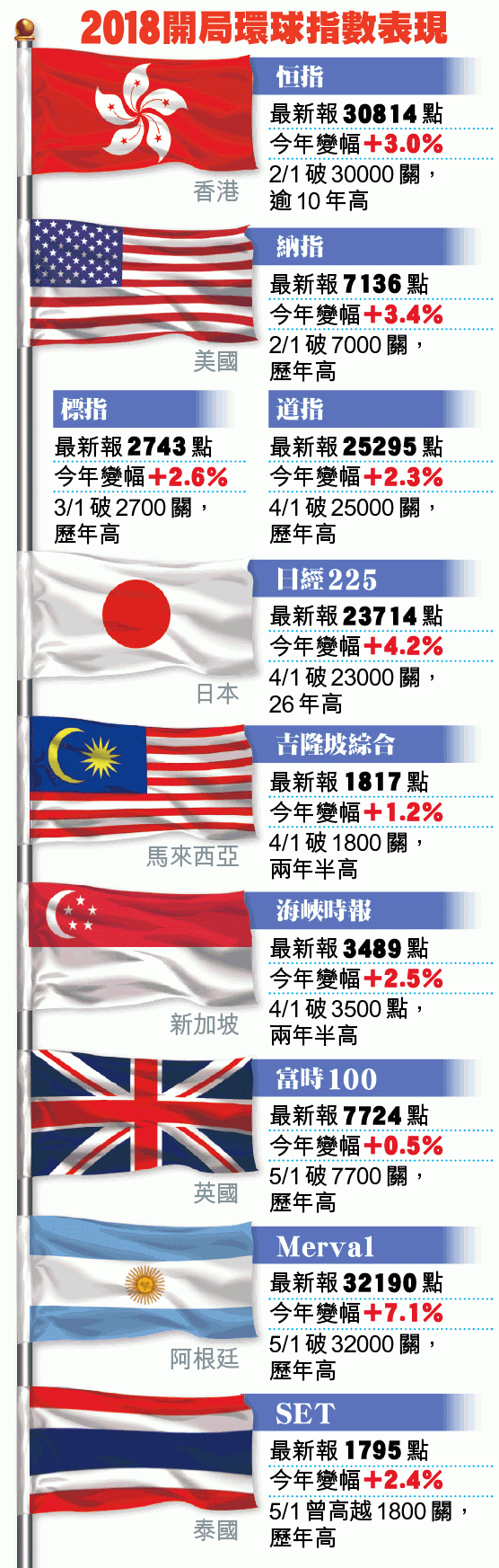 美股在道指破關前,上周二納指已率先衝上7000關,翌日到標指升抵2700關,三指數今年開局4個交易日已累升2.6%至3.4%,延續2017年的強勢;南美股以阿根廷表現最標青,Merval指數今年飆7%至越32000關。