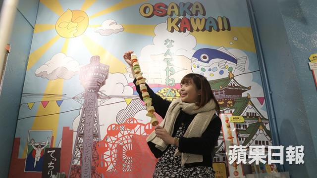 從繪本咖啡店步行大約15至20分鐘,來到西心齋橋就吃到超長的水果班戟串。在2樓的班戟店鋪面有點難找,沿汽水機旁的樓梯上去,就會看到其蹤影。水果班戟串分為三種尺寸,有20cm、40cm和80cm,現場所見食客多數選20cm的班戟串,專程來一戰特色班戟的記者當然選了80cm。