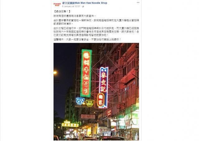 霓虹燈牌是香港街道的特色景觀,近年卻買少見少,月底將可能又少一個!佐敦白加士街的麥文記麵家月初於facebook表示,收到屋宇署的通知信,指店外的燈箱招牌和外牆的光管招牌均是違例,要即時清拆。