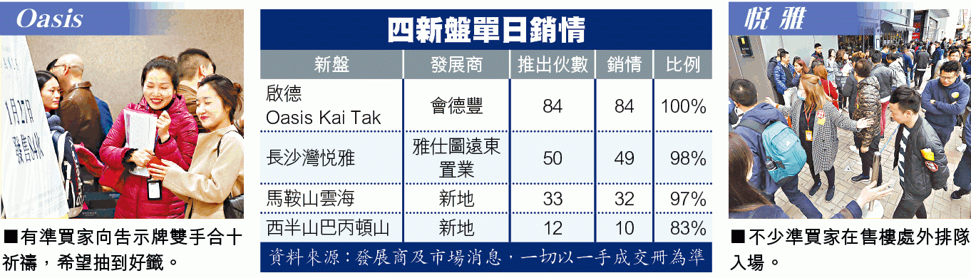 由會德豐地產發展的Oasis Kai Tak,昨首推84伙,一炮沽清,單位折實平均呎價2.27萬元,較一期開價高逾一成,仍獲不少買家排隊搶樓。記者在登記時間前所見,已有準買家在場守候,人龍排至數十米外,足足1小時才消化長龍,更有準買家為求中籤,雙手合十向樓盤告示牌祈禱,誠意十足。當中創同區新盤開價新高的30樓F室,叫價達2,347萬,呎價31,214元,照有買家承接,亦有大手買家斥資逾3,880萬連購3伙,包括一房、兩房及三房單位。