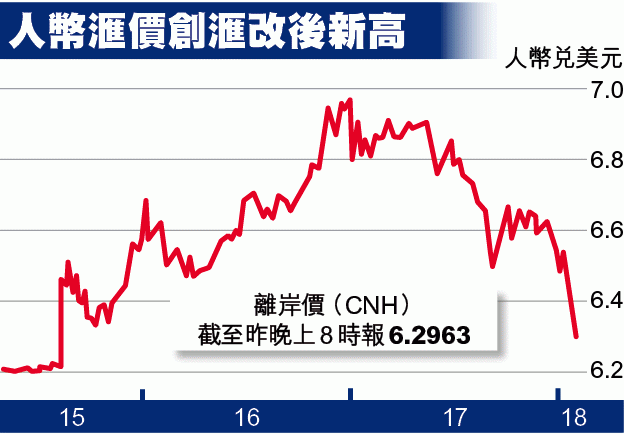 美滙指數上周跌穿90後持續走弱,令人民幣進一步升值。昨日由人民銀行開出的人民幣兌美元中間價報6.2885,按日再升160點子,創滙改以來新高。