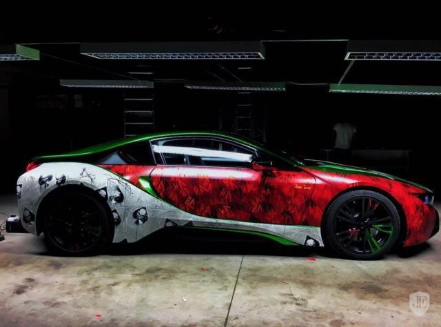 記不記得上年《自殺特攻:超能暴隊》(Suicide Squad)上映時,曾經有這部小丑版寶馬i8現身?這部並非官方art car,不過製作者Rene Turrek亦大有來頭,製作過Hulk版寶馬X6,還有美國隊長版的林寶堅尼Gallardo。這部小丑版寶馬車頭冚遇熱時有小丑樣現身,平時只是黑色,那何時會遇熱?直接淋熱水,或者行車行到熱熱哋囉。