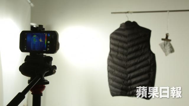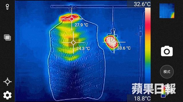 為了測試「發熱背心」是否較「暖貼」的體感溫度較高,我們找先前用「暖貼」的Tina再做測試,方法就是先除去所有暖貼,再試用發熱背心;基本在開着發熱背心1分06秒已開始感覺到熱氣,而且亦大約在3分鐘內,已感到身體暖和起來,Tina說:「感覺發熱背心較佳,頸部很暖!連頸巾都不需要;背部大範圍面積都發熱,整體感覺得舒服,不過前方沒感到暖,可能前方沒有發熱線吧!」為何一個覺得前方暖,但另一個感覺不到?肥通在此試作解釋,由於Lorraine的發熱背心穿在身上時,約大了半個碼,所以隨着身體的郁動,會令背心內的空氣流動,從而令熱氣在身體四周亂轉,相對Tina穿起來時緊身一點,熱氣在背心內較難走動,所以就暖不到前半身了,這個可能是兩人穿着經驗不同的原因。