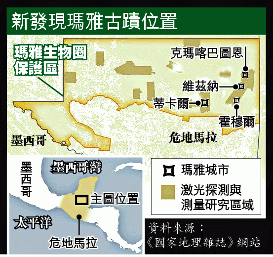 瑪雅文明研究有重大突破,國際考古團隊前日公佈在中美洲危地馬拉北部發現一個隱身森林數百年的「特大都市」,市內設備齊全,計有60,000所民居、金字塔、皇宮及高架路等,顯示瑪雅文明比專家估計規模更大,人口逾千萬。