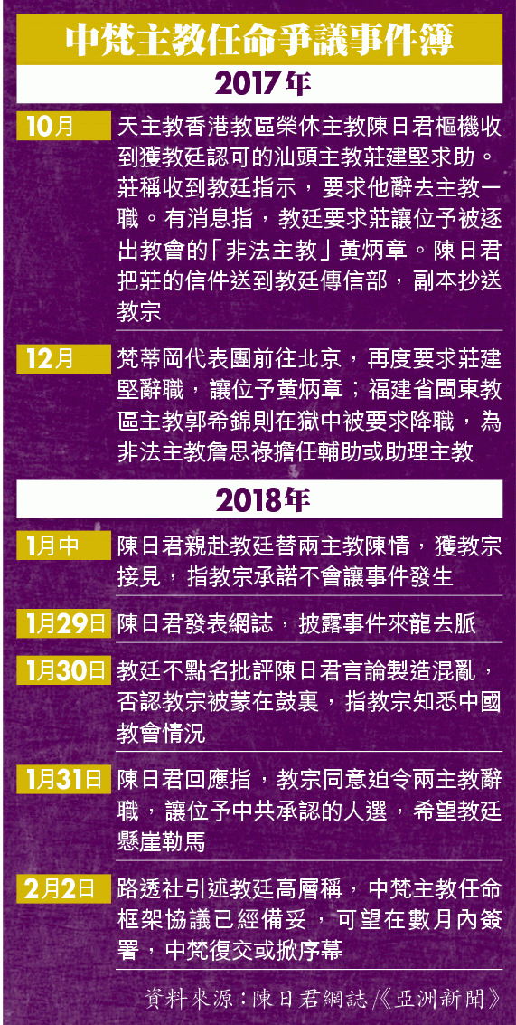 消息人士又不點名批評天主教香港教區榮休主教陳日君,指教宗密切留意中國教會的情況,也支持教廷勸退兩名合法主教,改任教區內其他職位,認為此舉有助與中國政府達成全面協議。