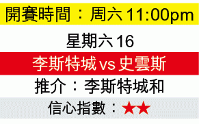 李斯特城周中不敵愛華頓,馬列斯因獲曼城斟介而缺陣,最終球隊以1:2落敗,但表現不算差,下半場有幾次扳平機會,只是欠運未能入球,惟主場威力不強。史雲斯爆冷擊敗阿仙奴後目前排尾二,信心有提升,作客有望搶分。