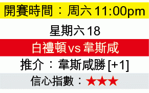 白禮頓剛作客遭修咸頓逼和,近六輪不勝,戰績為三和三負,目前排在15位,但實際仍在護級漩渦,對同級隊要打和不難,但主攻能力不強,要贏有頗大難度。韋斯咸近六輪不敗,戰績為兩勝四和,要注意是近仗作客發揮較佳。