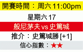 般尼茅夫周中作客爆大冷勝車路士後跳升到第10位,領先18位的修咸頓五分,尚未安全,今對史篤城是搶分戰,要注意是打和對主隊來說並不差,踢法或較保守。史篤城靠主場搶分,今季英超作客僅一勝,易帥後最大改變是失球減少。