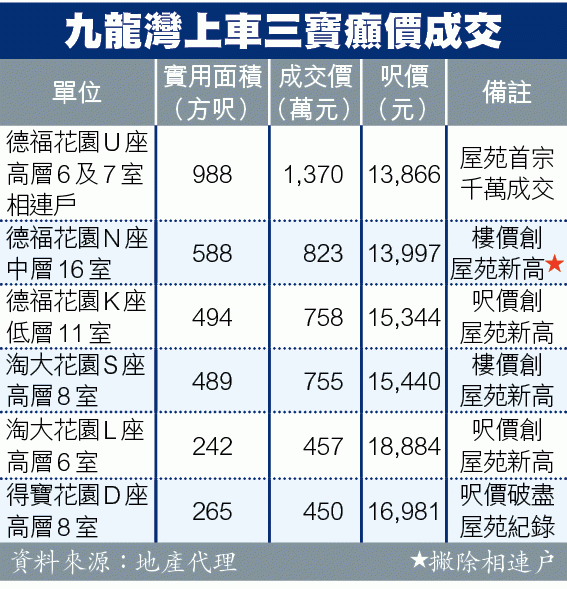 【本報訊】觀塘地王效應,東九龍樓市隨即癲了。上月24日賣地後至今,東九龍錄得最少10宗破頂,九龍灣「上車三寶」德福花園、淘大花園及得寶花園佔最少7宗。德福花園更驚見首宗千萬樓王誕生,超罕有相連戶癲賣1,370萬元,破盡同區紀錄。