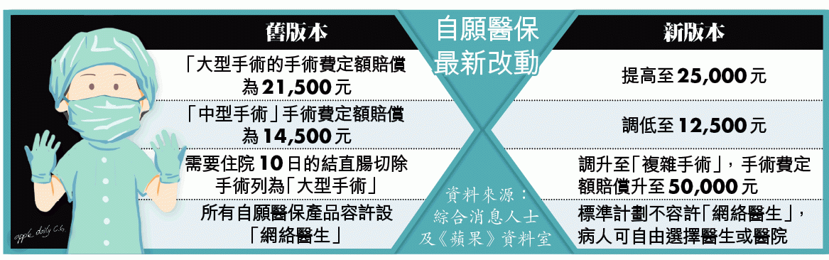 【本報訊】自願醫保臨近出台之際一改再改。據悉,政府日前再決定調整部份手術賠償額,膽囊切除等「大型手術」的手術定額賠償由2.15萬元調升至2.5萬元;惟「中型手術」的定額賠償卻下調13.8%至僅1.25萬元,連同其他費用,若接受6.3萬元的甲狀腺切除手術,病人仍要自付2萬元或31.7%。病人組織及市場人士均認為當局的修改旨在「頭痛醫頭腳痛醫腳」,無正視計劃賠償額過低的問題。