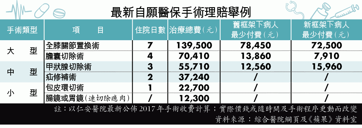 據悉,當局同時把「大型手術」的手術費賠償,由2.15萬元,調升至2.5萬元;及把「中型手術」的手術費賠償由1.45萬元減至1.25萬元。假設病人於仁安醫院接受屬中型手術的甲狀腺切除手術,治療總費5.57萬元,舊框架下病人需付1.26萬元,但在最新改動下,就需付1.6萬元,多了3,400元。