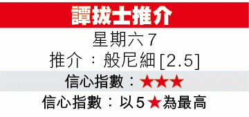 另外,明日焦點利物浦對熱刺是筆者今周的重心,考慮到前者季內主場強勁,對前六球隊不敗率甚高,就捧紅軍主場拔「刺」。