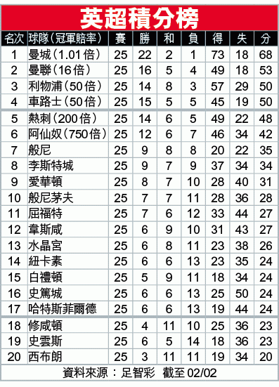 英超多支前列球隊在周中賽期失分,車路士主場吞蛋後,被利物浦趕過跌至第四位,而曼聯與阿仙奴亦告全失三分;今周焦點戰是明日紅軍迎戰熱刺,另外,西布朗迎修咸頓是名副其實的護級大戰,而一哥曼城今日早場作客擅守的般尼未必可大勝而回,可冷吼[2.5球]的「細」。