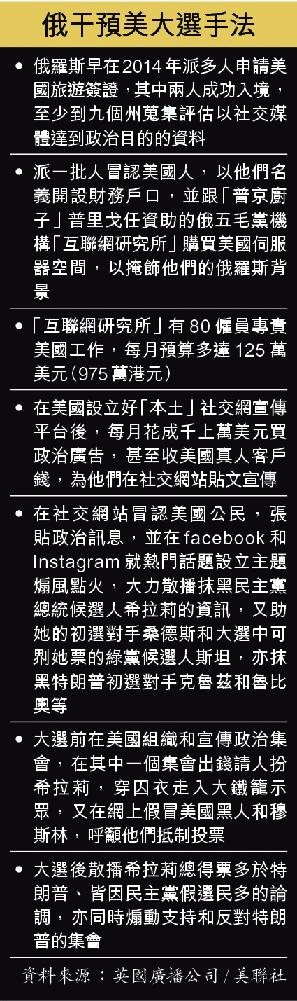 2016年6月,這個潛伏美國一段時間的俄國網絡終派上用場,高層拍板要全力削弱民主黨總統候選人希拉莉,力撐她的黨內對手桑德斯和剛贏得共和黨提名選總統的特朗普。他們開始在各大美國政治群組搞串連,組織支持特朗普的集會,同時慫恿民主黨票倉的黑人和穆斯林選民不要投票,甚至大膽出錢招攬不知情的美國人,在活動上假扮成穿着囚服的希拉莉來抹黑對方。