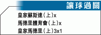 皇馬上周中歐聯16強首回合憑C朗梅開二度,以3:1擊退巴黎聖日耳門,雖說出線未算十拿九穩,不過次回合到三月初才舉行,皇馬也可全力在聯賽保前四。