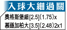 同日德甲奧格斯堡主場對史特加,兩隊同樣守強攻弱,今仗形勢勢陷膠着,捧[2.5球]「細」。(球賽編號:星期日16;now670、有線61及64台今日10:30pm直播)