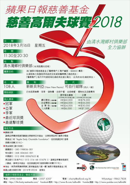 「蘋果日報慈善基金」於2018年3月16日在「清水灣鄉村俱樂部」再舉行「蘋果基金慈善高爾夫球賽2018」。