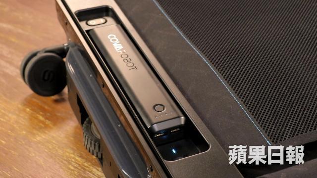 值得留意的是,雖然COWAROBOT R1跟篋會送一個智能手帶,但這條手帶只是用於感應距離和解鎖智能鎖,當行李箱離開用家時作會震動和閃燈提示。跟隨功能是靠手柄上的相機雷達認人。入好電池開機,拉高手柄,再拉下手柄上的按鍵,行李箱底部就會放下一對電動輪開啟跟隨模式。