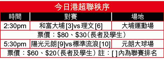 【本報訊】港超聯今日續演兩場賽事,其中和富大埔會在主場迎戰近況不俗的理文;陽光元朗與標準流浪就會在元朗大球場合演護級大戰。