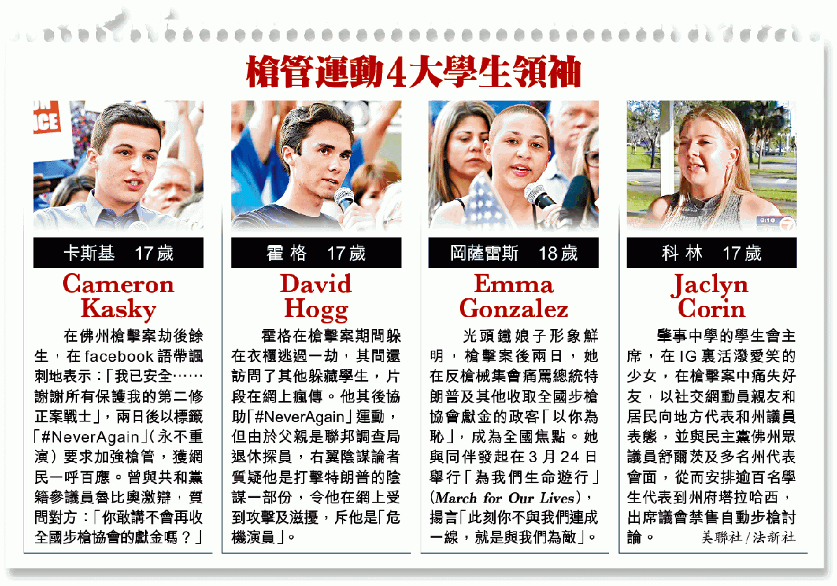 在19年前科羅拉多州哥倫拜恩高中槍擊案後出生、從小做慣封鎖學校防槍擊演習的「00後」新生代已長大。他們厭倦政客空談,紛紛站起來,以社交網作武器,沒有預演、沒有「大台」下,各自表態但目標一致,不但在各州開花,更網上約定3月24日首都華盛頓聚頭舉行「March for Our Lives」(為我們的生命遊行),以民意撼金權。