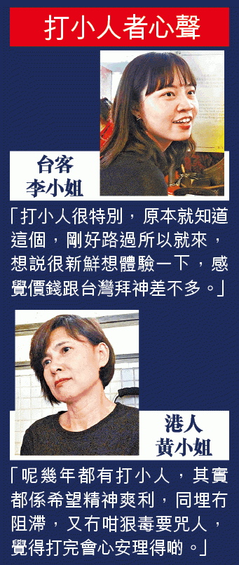 鵝頸橋底昨有近10名神婆開檔打小人,香火滿天加上鞋聲啪啪,吸引不少路過的旅客駐足拍照。台灣旅客詹小姐和李小姐經過橋底順道光顧,祈求打小人後工作順利。港人張氏夫婦則指今年犯太歲,希望新一年「少啲麻煩嘢,冇乜小人篤背脊」張太認為打完小人後「感覺會順利啲,冇咁多是非」。