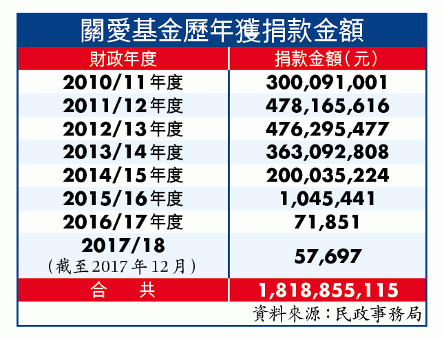 政府非首次額外撥款予關愛基金「派錢」。2011/12年度財政預算案提出向全港市民派6,000元,但不包括居港未滿7年的新移民,惹起非議,其後政府額外注資15億元經關愛基金發放。關愛基金原本計劃由政府出資50億元,再向商界募捐50億元,以協助有需要社群。但募捐成效欠佳,由2010年籌得約3億元,大幅下降至去年僅5.7萬元。基金現有193億元盈餘,但當中150億元是政府於2013/14年度再度額外注資。