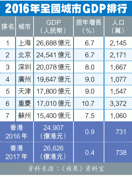 統計處上周公佈,香港2017年經濟生產總值(GDP)為2.66萬億港元,升幅3.8%。差不多時間,深圳市公佈,去年全市GDP總量為2.24萬億元人民幣,以去年底匯率折合2.68萬億港元,首次超越香港,如公平地以全年平均匯率計,則為2.59萬億港元,僅輕微少於香港。