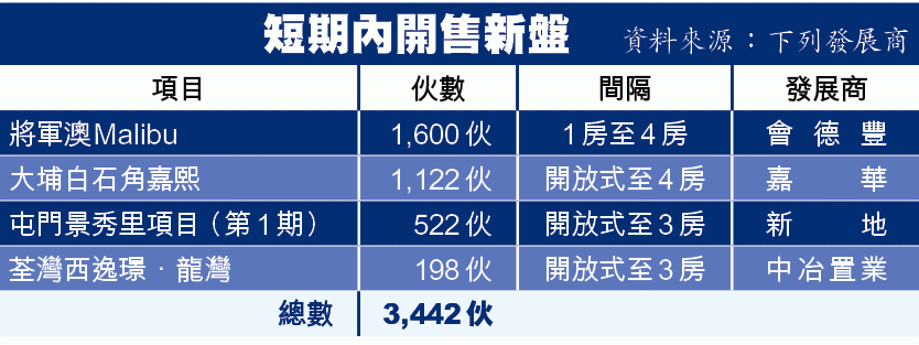因應財政預算案沒實質措施控制樓市需求,各發展商厲兵秣馬,按原有步伐推出旗下新盤,預期本月除了Malibu短期開售外,緊接其後相信最大機會為嘉華(173)大埔白石角嘉熙,連同新地屯門項目和中冶在港首個發展項目荃灣逸璟.龍灣,共可提供逾3,400個單位。