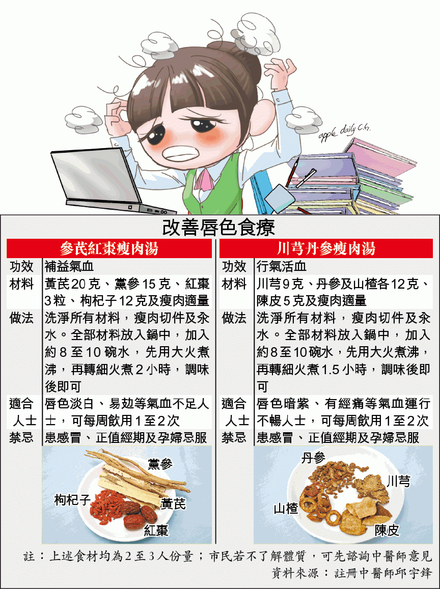 唇色偏向暗紫甚至有瘀斑,或反映身體的氣血運行不暢順,受氣滯血瘀所影響,邱稱如平日經常吃生冷食物、凍飲,引致體內有寒氣,阻礙了氣血推動和運行。另外,都市人經常久坐、缺乏運動習慣,或心情常鬱悶,都可致氣血停滯不前。唇色暗紫的女性若氣血運行差,也容易受經痛、來經有血塊等問題困擾。要促進氣血運行,建議多運動、曬太陽,保持好心情。氣滯血瘀人士可食用田七、丹參、青皮、桃仁等中藥,幫助身體行氣活血,推介用川芎、丹參及山楂等煲「川芎丹參瘦肉湯」飲用,有行氣活血、改善唇色的功效。