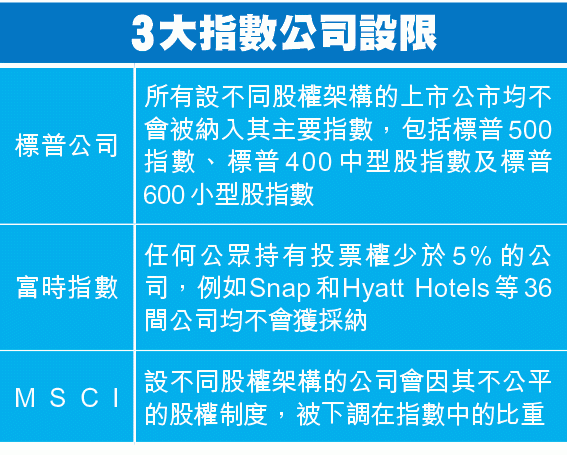 去年底指數公司加入戰團,表明不支持上司公司採用多重股權架構(見表)。