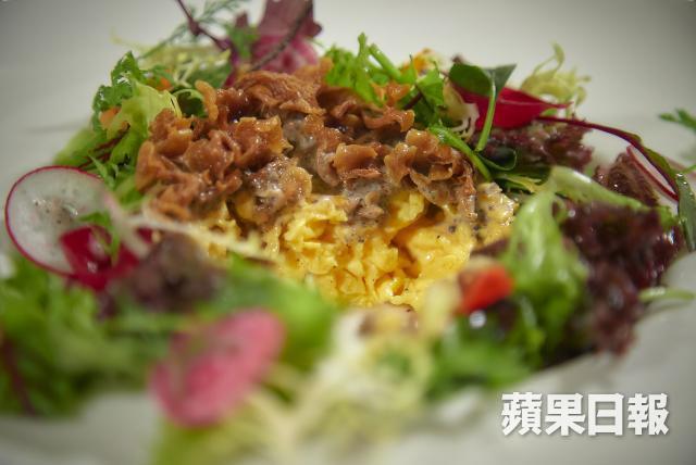 其實這間餐廳已經開業23年,老闆Samson是香港人,一直都非常低調,不願上鏡,曾經有電視台來做採訪,但Samson都沒有讓他們進入廚房拍攝,今次我們就成為首間直擊此店廚房的傳媒。藍浥菲剛剛完成松露炒蛋配沙律的擺盤,就着我趁熱嚐嚐這道菜,「這綜合沙拉菜算是我們招牌菜,外面會放些綜合沙拉菜,先把它伴芝麻油,底層的松露炒蛋,是用牛油炒的蛋,中間再放一點松露忌廉。」之所以叫招牌菜,是因為每次這道菜從菜單下架,都有客人要求一定要再吃,最精粹其實是上層的雜菇,用牛油、橄欖油將菇由生炒到熟,脆香的雜菇夾着嫰蛋,是外面做不到的味道。
