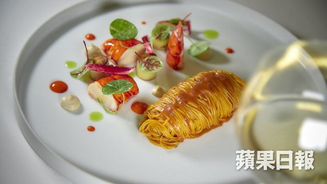 一道龍蝦天使麵竟收TWD2,200($588),原來是因為台灣進口食材的成本很貴,「這個龍蝦是加拿大進口的,我們用真空低溫處理,低溫慢煮,龍蝦口感會好一點。」藍浥菲說。自家製的天使麵以番茄及龍蝦汁熬煮,口感軟中帶韌,麵條吸盡龍蝦汁鮮味,而龍蝦肉則帶海水鹹味,肉嫰鮮甜。