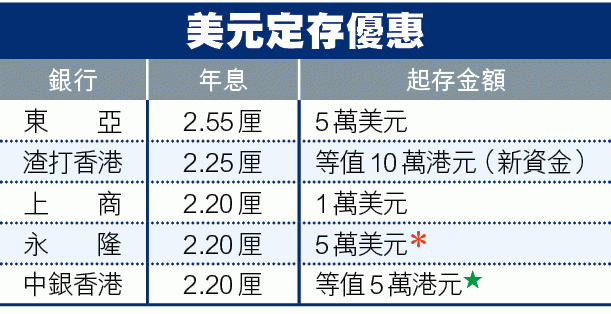 目前多間銀行提供2.2厘或以上美元定存優惠,當中東亞(023)的息率一直稱冠,一年期美元定存年息高達2.55厘,起存金額為5萬美元(約39萬港元);若開立5萬美元定存,一年後即實際收息1,275美元(約1萬港元)。