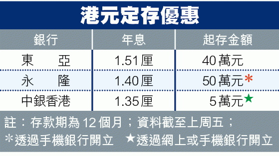 比較現時港元定存,由於本港銀行同業拆息(HIBOR)未有跟隨美息上調,一年期存息仍保持於1.4至1.5厘水平,一般起存門檻約50萬元;若存款額較低,港元定存年息甚至不足1.4厘,足足較美元定存低逾1.15厘。
